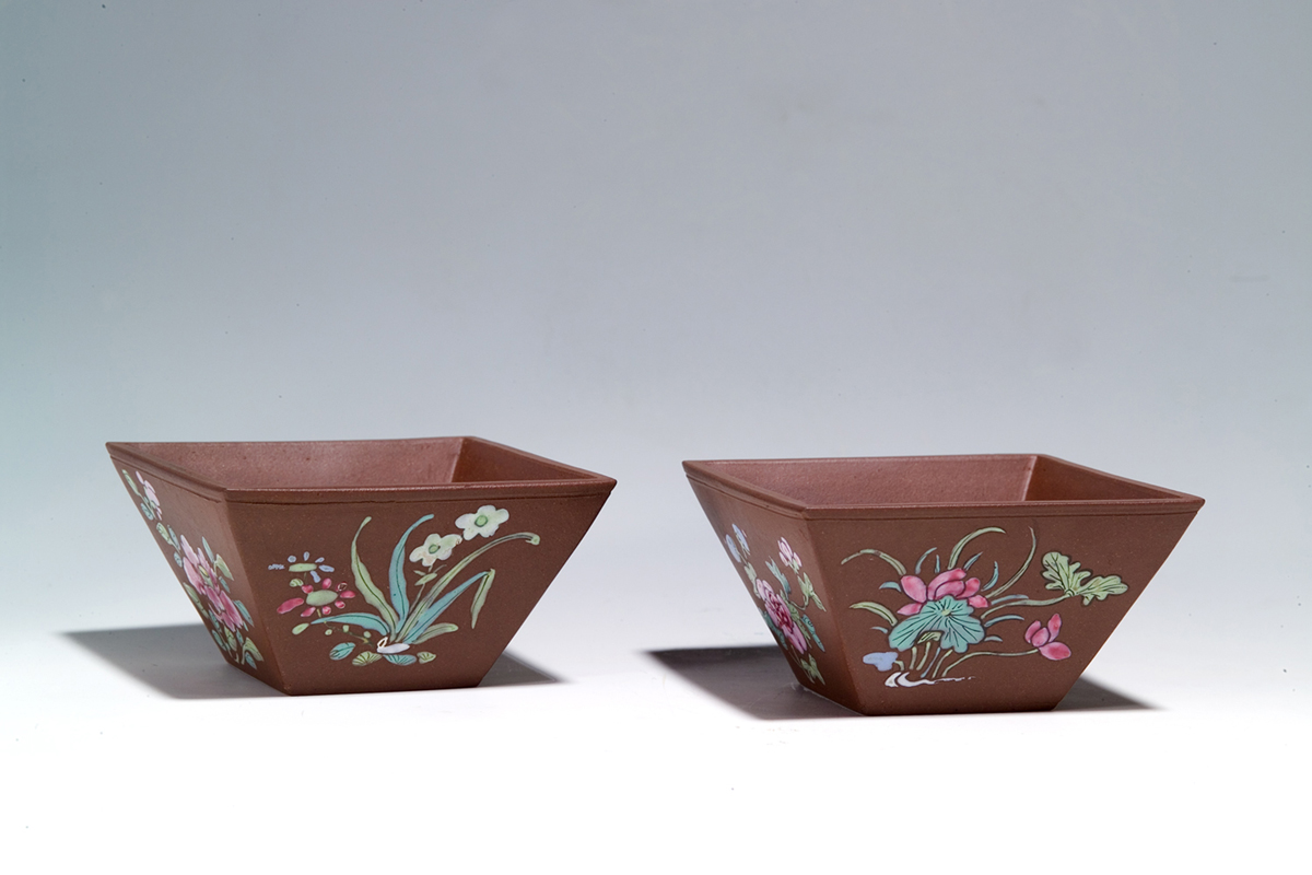 斗杯流行於晚明至乾隆時期,較著名的有西園雅集及沈存周所製錫杯可供比較。紫砂加琺瑯彩繪始見於康熙時期,此對斗杯片接而不變形,做工精良;所繪各種花卉,簡練而生動,設色淡雅,當屬康熙晚期至雍正時期的作品。