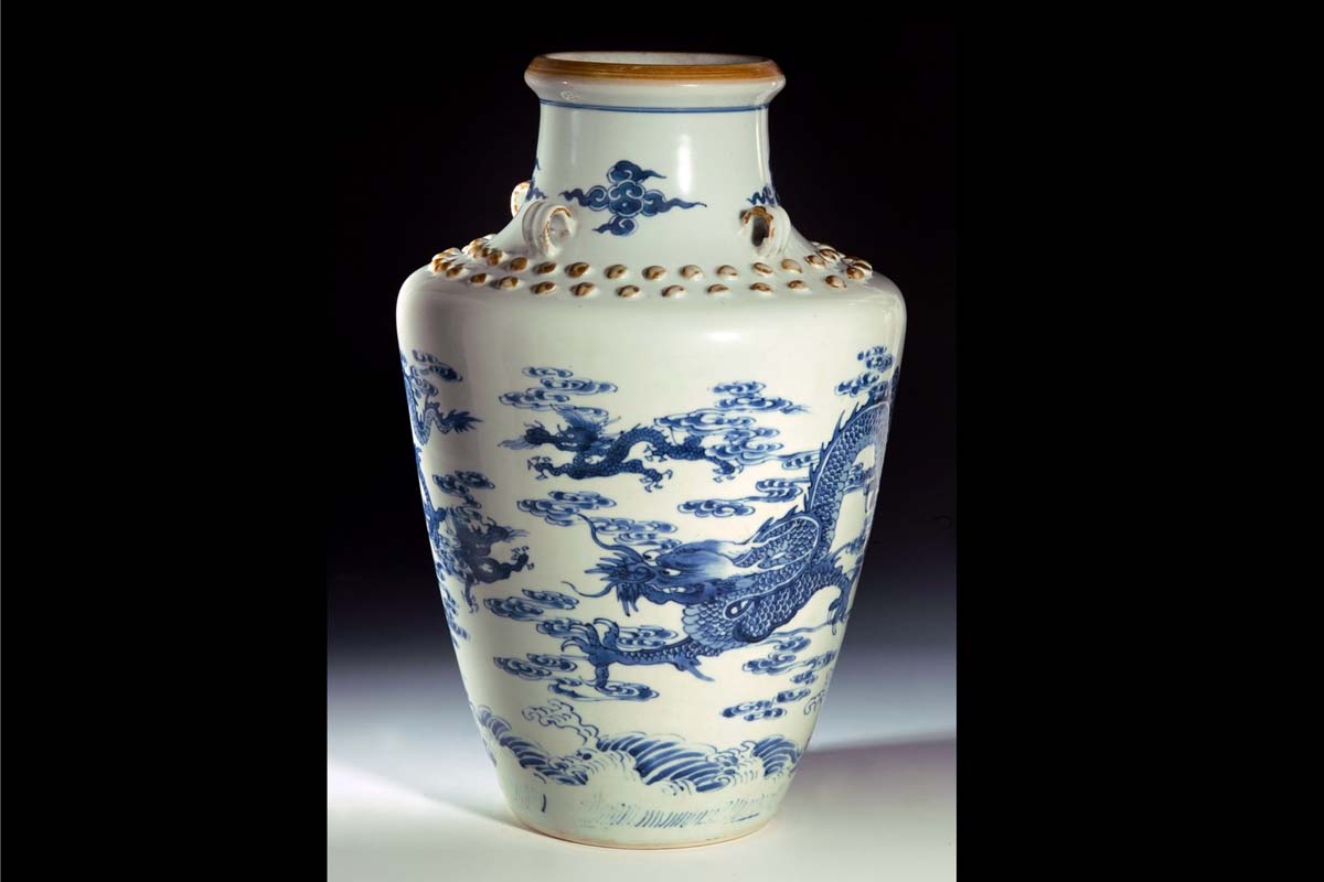 罐身修長,比例勻稱,肩部貼塑乳丁紋及四繫耳,口沿飾褐釉,屬晚明風格。器身繪雲龍紋,雲紋連綿,颯颯如聞風聲,大龍小龍呲牙裂嘴穿梭其間,神態威猛,瓶身下方繪海浪紋,翻騰起伏,波濤洶湧,全器盡顯陽剛之氣。