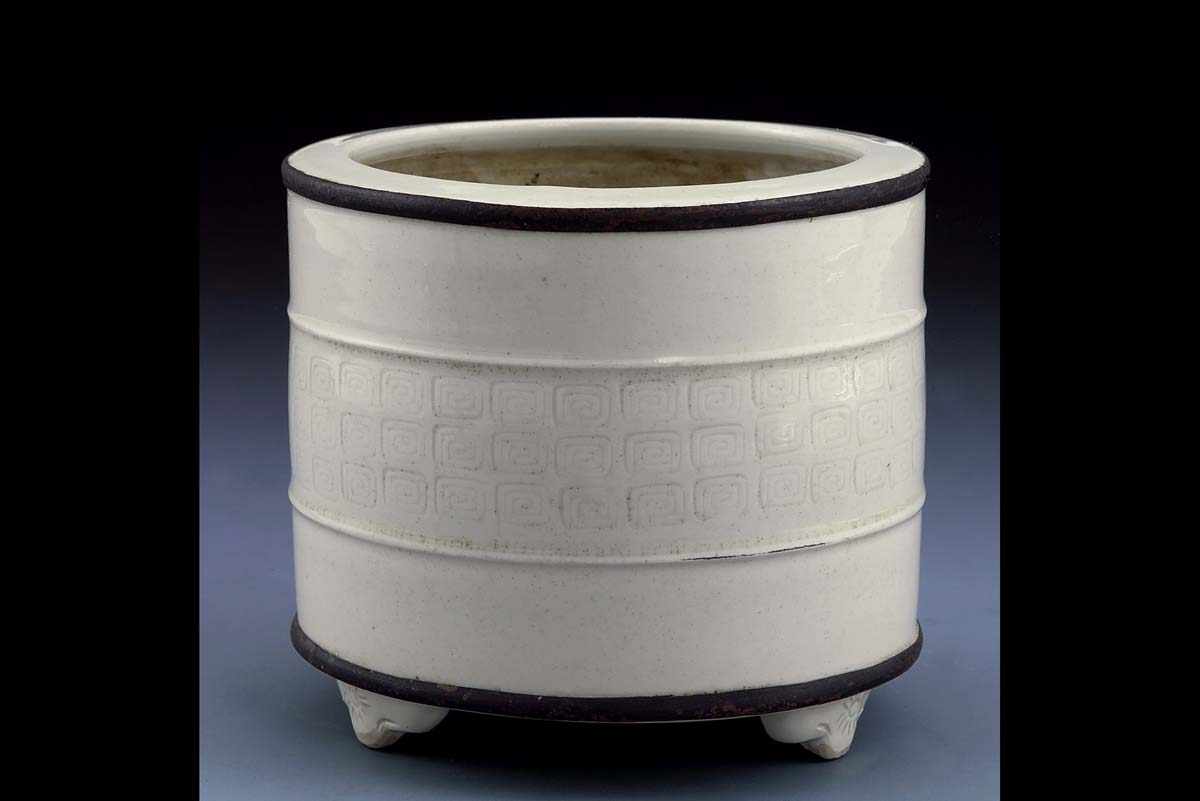 德化窯與定窯都以白瓷著稱,弦紋爐即源自於北宋定窯。而與定窯不同的是,此爐於爐身中帶之處加印回紋,而口沿略微高提的收束手法,與微微圓塌的爐底相映,使得整體器形顯得更加的圓潤飽滿,充滿文氣,是德化窯香爐中的精品。